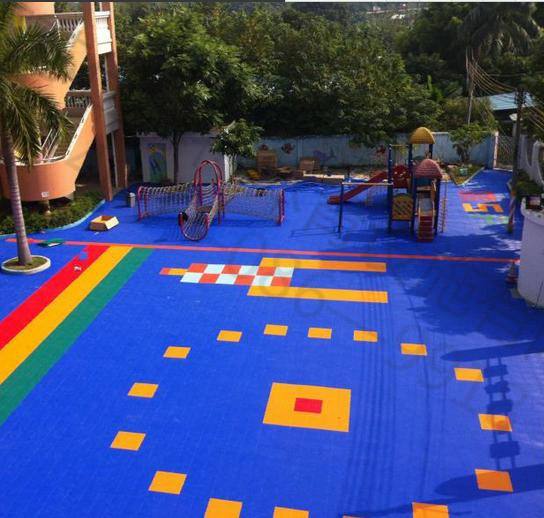 悬浮拼装地板成品为块状,可直接铺装在水泥或沥青的基础表面,无需粘接,每一块地板之间用锁扣进行连接,安装方便,施工简单快捷,不影响正常的上课,铺设完工即可使用,不必担心气味或是污染。悬浮式拼装地板表层经特殊处理,不吸光、不反光,保护儿童眼睛;低热反射,无湿气,不吸汗,不会产生滞留气味。