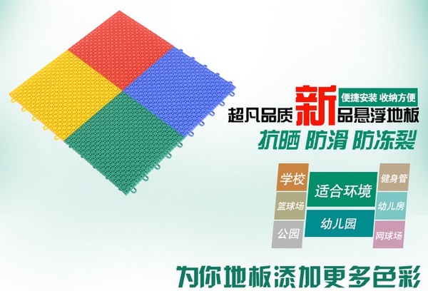 拼装地板使用聚丙烯原料生产,无毒无味,安全环保,河北拼装地板厂让人们在一个健康的环境下玩耍;拼装地板具有减震、能量回送性能及侧向缓冲功能,可以防止运动伤害;拼装地板原料聚丙烯为高强度材料,加入具有抗紫外线辐射、抗氧化、抗寒等成分原料,使该产品具有耐压、耐冲击、耐低湿、使用寿命长等优点。耐候性高,不怕日晒高温、雨淋潮湿、冰雪严寒、不易翘曲剥落变形。拼装地板具有特殊的排水结构,雨后场地不积水;拼装地板可以随时拆卸和移动,让您随心所欲的DIY自己理想中的场地;拼装地板广泛应用于多种球场、幼儿园、赛事等,专业的运动性能有目共睹。